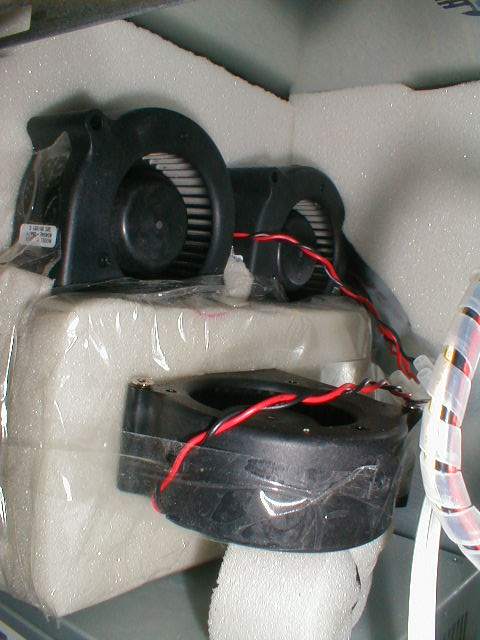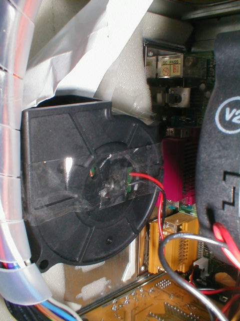 Anstelle des Lüfters von Coolermaster setzte ich 2 Radiallüfter ein (Weitere Infos und Bilder) – mit doppelseitigem Klebeband und 4 Kabelbinder –