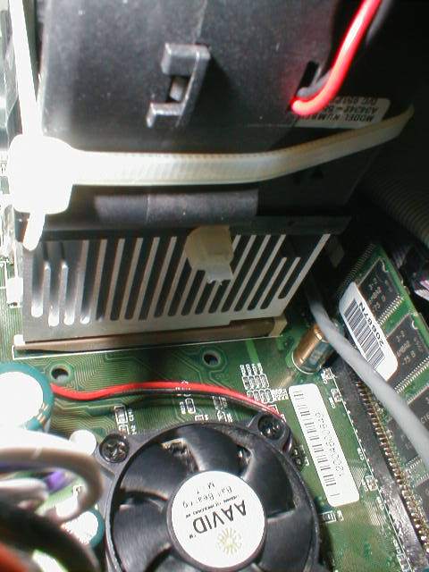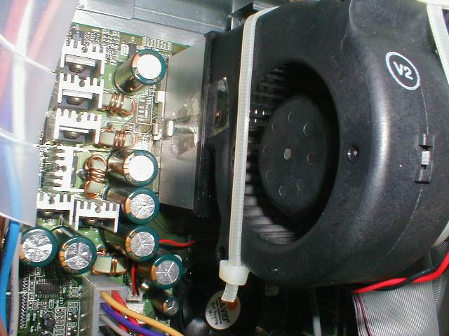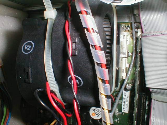 Also habe ich habe bestellt. Radiallüfter von Conrad für 9,95DM / Stück. Von meinem Cooler-Master DP5-6H51 habe ich den Lüfter entfernt. Die Radiallüfter habe ich mit doppelseitigen Klebeband zusammengeklebt, und mit 2 Kabelbindern an den Kühlkörper befestigt. Das schöne an dem Cooler-Master ist das er einen Kunststoffkragen hat und daher die Lüfter gut zu befestigen sind.